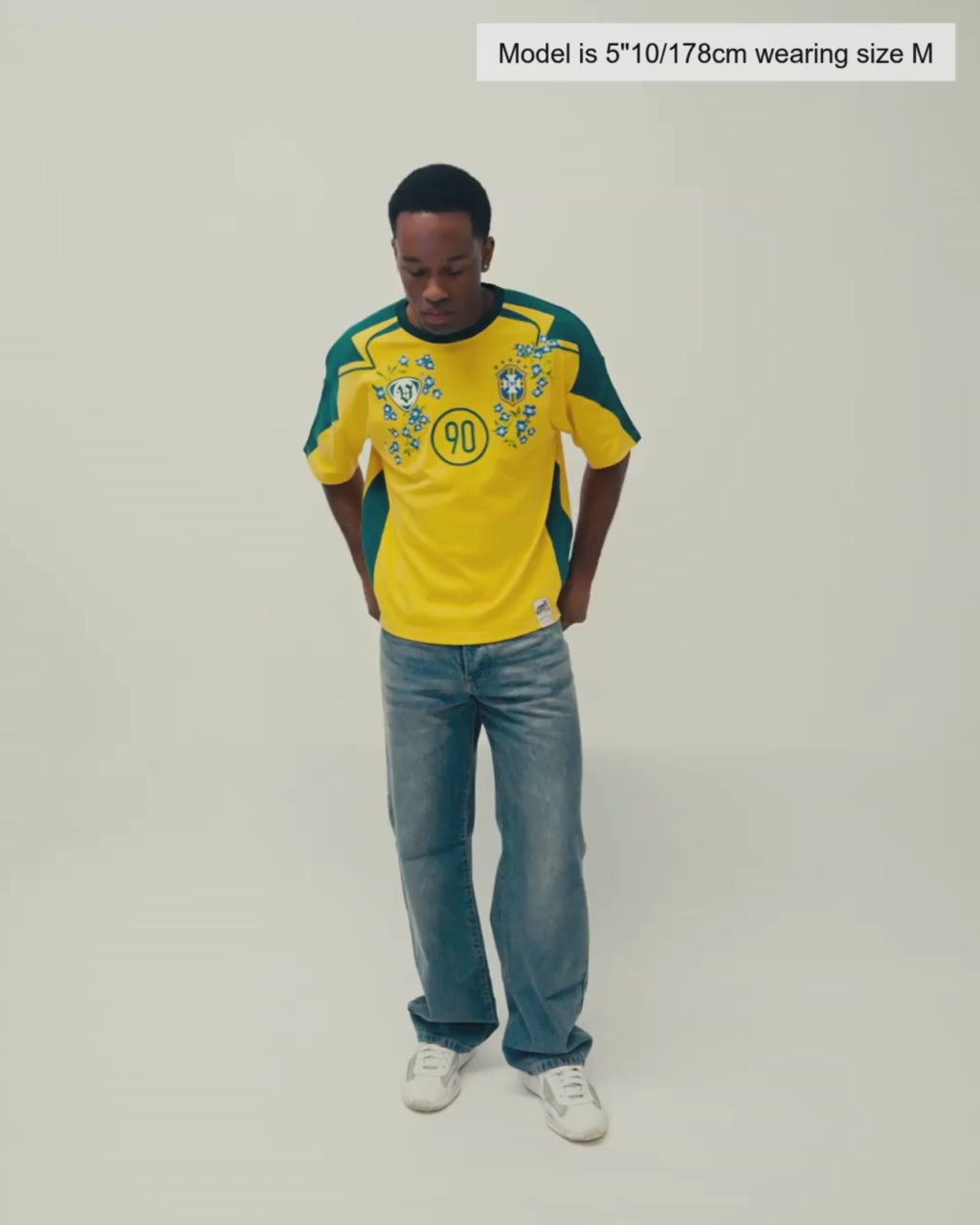 A tribute to flair, both on and off the pitch. This 100% organic cotton jersey fuses Brazil’s iconic football heritage with vibrant floral embroidery, reimagining the number 90 in full bloom. Finished with intricate chest detailing and a jaguar-branded woven label.