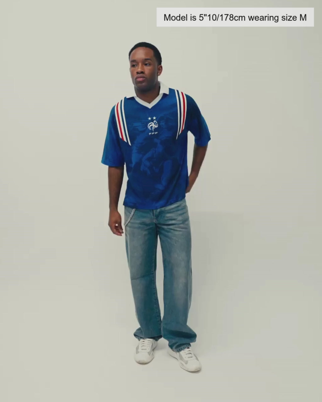 A tribute to French legacy — this piece reimagines the nation’s most iconic painting, Napoleon Crossing the Alps, woven into deep navy cotton. Tricolour stripes descend from the shoulders, while the chest is embroidered with the French football crest.