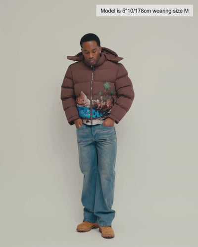 Crafted in a deep brown tone, the Rihla Puffer introduces a statement embroidery panel that wraps around the jacket like a moving mural. The detachable hood adds versatility, while the desert scene—travellers, camels, palms, water—unfolds in dense, high-precision stitching exceeding 2 million stitches.