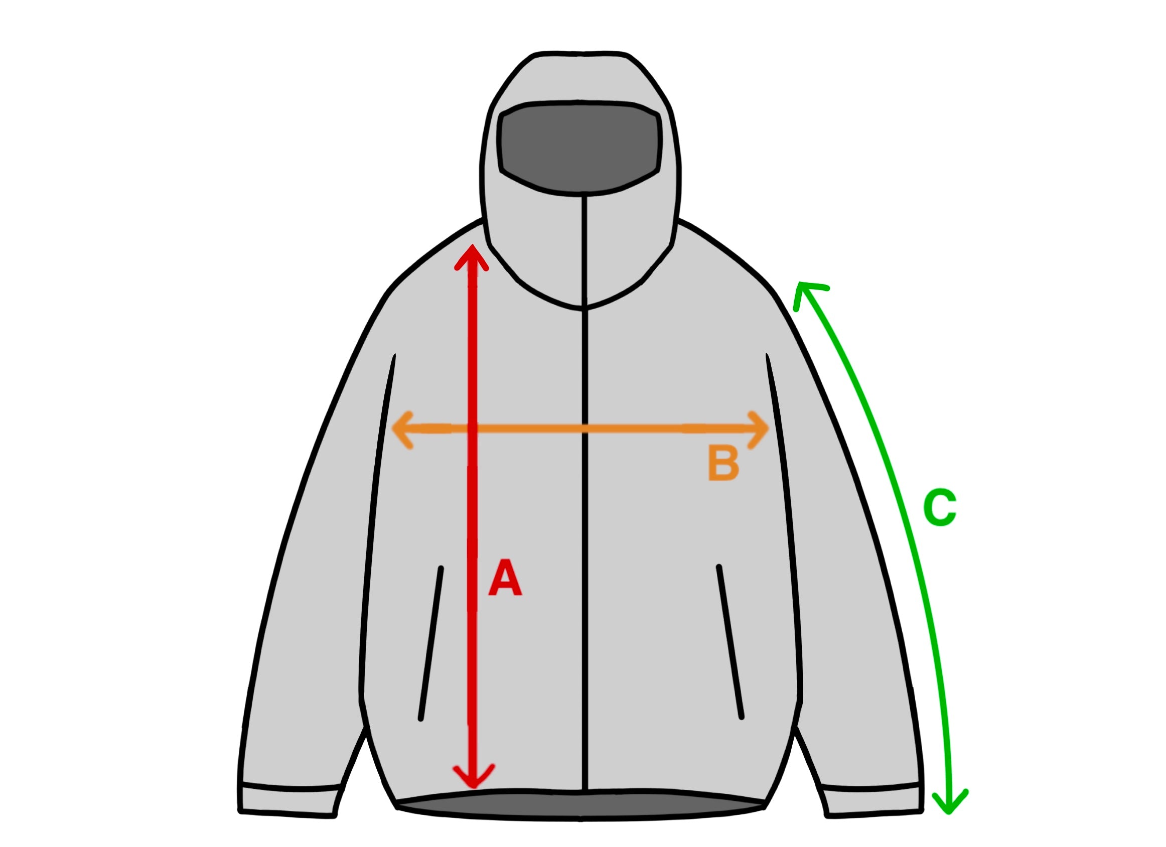 | Size | Length (A) | Chest (B) | Sleeve (C) |