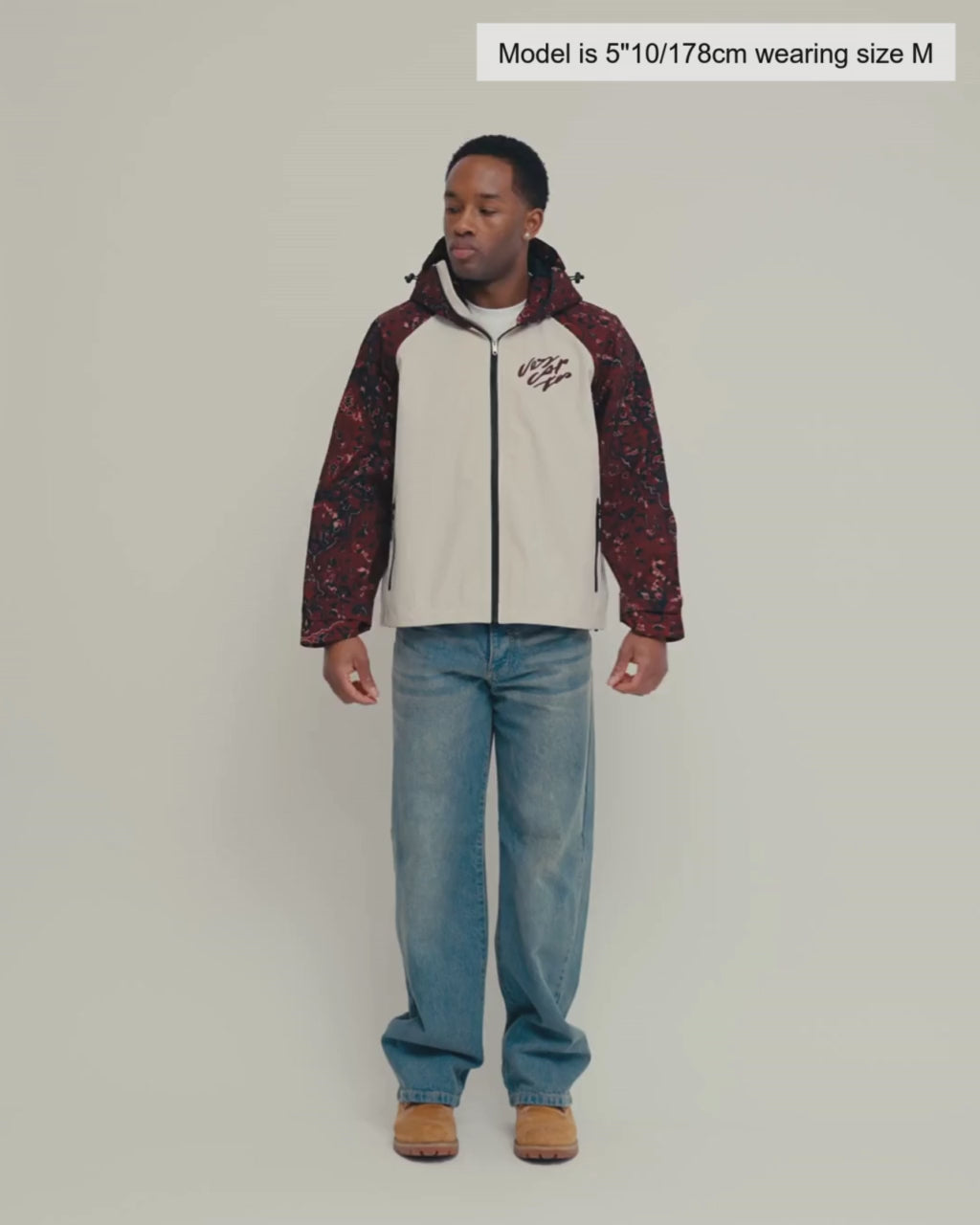 A modern shell built around the elegance of Persian textile design. The cream 3-layer body contrasts with rich maroon rug motifs that run across the hood and sleeves, bringing a sense of tradition to a fully technical silhouette. Finished with an Arabic-script chest embroidery and adjustable details throughout.